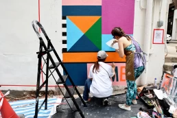位於上環東街55號(水巷路口)的這幅作品《看看你走了多遠》以懷舊桌上遊戲「飛行棋」為靈感,將充滿本地特色的童年回憶畫進壁畫,配上大膽鮮明的色彩及幾何組合,敘述勇敢向前邁進的故事。飛行棋「移動」的特色與太平山街和整個城市的特徵相似——以步行而聞名,透過充滿趣味的設計,鼓勵自我反思,邀請大家用片刻回顧自己的旅程。這是對我們自身起點的致敬,也是對變化之美的讚頌,提醒我們在持續前行的同時,勇敢地回顧並感激過去的經歷。